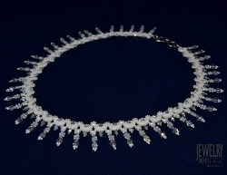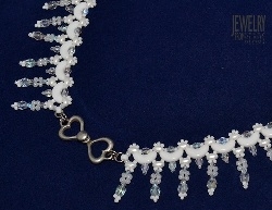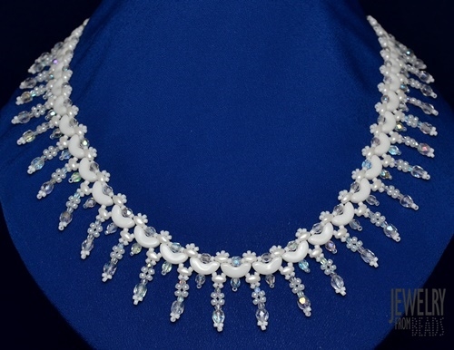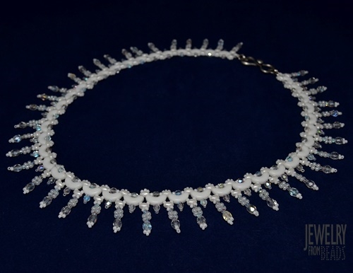 Nemůžu si pomoci, ale okraje náhrdelníku mi připomínají malé rampouchy či visící krápníky v jeskyni. I když nese název “…jen ulomit …“, rozhodně bych to nedoporučovala. Návod tentokrát sestává z dvou fází šití, základního obvodu a následného došití ohňovek do středových částí Arcosu. V bílé barvě bude slušet nejen vám, ale může zdobit také nevěstu. Neméně zajímavé budou i jiné barevné kombinace, na které se moc těším.