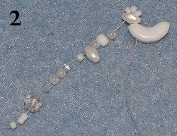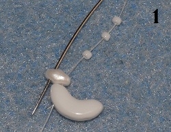 Na jeden konec nitě v délce cca 1,75 m navlečte 1x A první krajní dírkou, 1x M první dírkou, 3x TW 15/0 a prošijte 1x M druhou dírkou (obr. 1) Druhý konec nitě v délce cca 1,75 m si ponechejte, budete s ním došívat středové části korálků Arcos po zhotovení základního obvodu. Zajistit si ho můžete pomocí stopperu nebo stop korálku. Navlečte 1x TS 11/0, 1x TW 8/0, 1x TS 11/0, 1x M první dírkou, 1x TW 15/0, 1x O2, 2x TS 11/0, 1x O2, 1x O4 a 3x TW 15/0 (obr. 2).