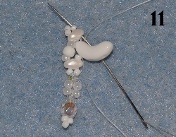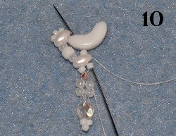 Prošijte druhou dírkou 1x M, 1x TS 11/0, 1x TW 8/0, 1x TS 11/0, 1x M první dírkou a 1x TW 15/0 (obr. 9). Prošijte vedlejší 1x TW 15/0, 1x M druhou dírkou, 1x TW 15/0 a 1x A první krajní dírkou (obr. 10).