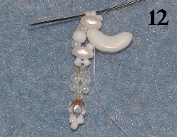 Ještě jednou si celé kolečko zopakujete a to proto, aby se korálek TW 8/0 povystrčil a mohli jste do něj pohodlně vložit kroužek. Prošijte 1x M první dírkou a 1x TW 15/0 (obr. 11). Prošijte 2x TW 15/0 (obr. 12).