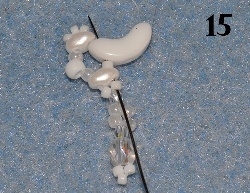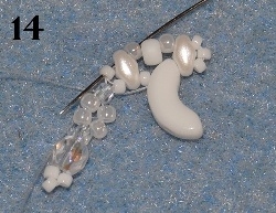 Prošijte 1x M druhou dírkou, 1x TS 11/0 (obr. 13). Vynechte TW 8/0. Prošijte 1x TS 11/0, 1x M první dírkou a 1x TW 15/0 (obr. 14).