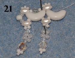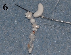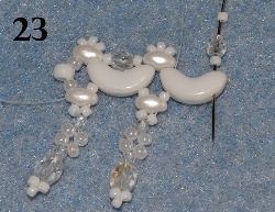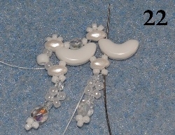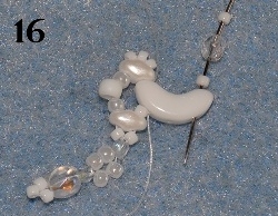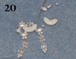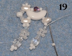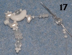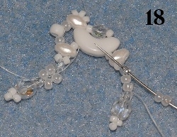 Navlečte 1x TW 15/0, 1x M první dírkou, 1x TW 15/0, 1x O2, 2x TS 11/0, 1x O2, 1x O4, 3x TW 15/0. Prošijte 1x O4 a 1x O2 (obr. 17). Navlečte 2x TS 11/0 a prošijte 1x O2 (obr. 18).
