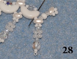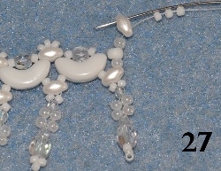 Navlečte 1x TS 11/0, 1x TW 8/0, 1x TS 11/0, 1x M první dírkou, 3x TW 15/0 a prošijte 1x M druhou dírkou (obr. 27). Prošijte 1x A třetí krajní dírkou (obr. 28).