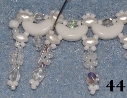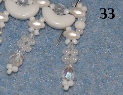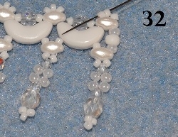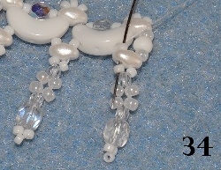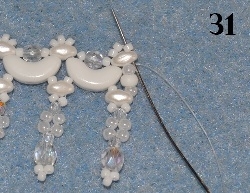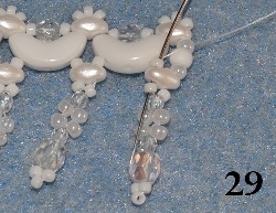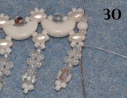 Prošijte 1x TW 15/0, 1x M první dírkou a 1x TW 15/0 (obr. 29). Prošijte vedlejší 1x TW 15/0, 1x M druhou dírkou, 1x TS 11/0, 1x TW 8/0, 1x TS 11/0 (obr. 30).