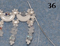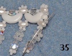 Prošijte vedlejší 1x TW 15/0, 1x M druhou dírkou a 1x TS 11/0 (obr. 35). 1x TW 8/0 vynechte. Prošijte 1x TS 11/0, 1x M první dírkou a 1x TW 15/0 (obr. 36).