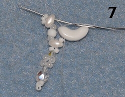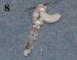 Nyní budete prošívat pro zpevnění část již všitých korálků, jelikož korálek TW 8/0 nám bude sloužit jako očko pro kroužek. Prošijte 1x M první dírkou a 1x TW 15/0 (obr. 7). Prošijte 2x TW 15/0 (obr. 8).