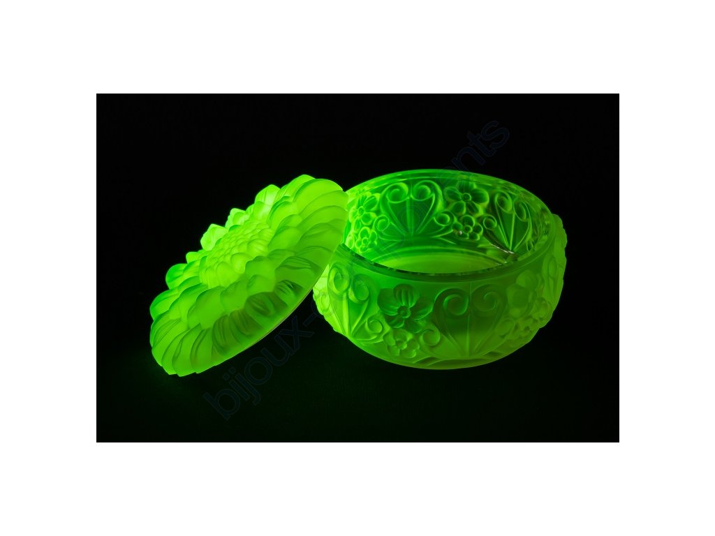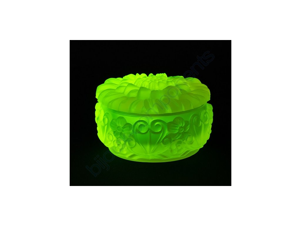 Materiál: Sklo s příměsí oxidů uranu, které se vyznačuje výraznou luminiscencí. Pod UV světlem (černým světlem) se dóza jasně rozzáří sytě zelenou barvou.