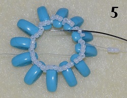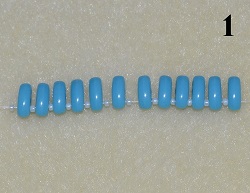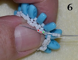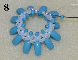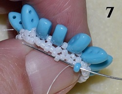 Jehla vychází ze středového korálku T 15/0. Navlečte 1x PM 10/0 a prošijte 1x T 15/0 - středový korálek (obr. 7). Postup opakujte do konce řady. Na konci prošijte 1x T 15/0 a