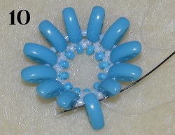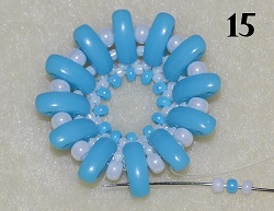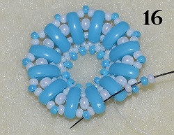 Navlečte 1x PB 10/0, 1x PM 10/0, 1x PB 10/0 a prošijte 1x C vrchní dírkou (obr. 15). Postup opakujte do konce řady. Na konci řady prošijte 1x C vrchní dírkou, 1x PB 10/0 a 1x PM 10/0 (obr. 16).