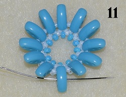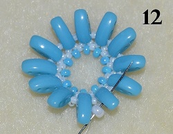 Prošijte totéž C prostřední dírkou (obr. 11). Navlečte P 8/0 a prošijte C prostřední dírkou (obr. 12). Postup opakujte do konce řady.