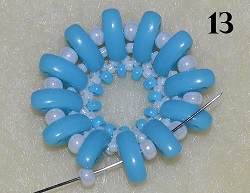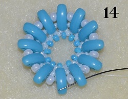 Na konci prošijte s posledním korálkem 1x C prostřední dírkou, 1x P 8/0 a 1x C prostřední dírkou (obr. 13). Poslední prošité C prošijte vrchní dírkou (obr. 14).