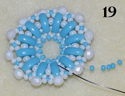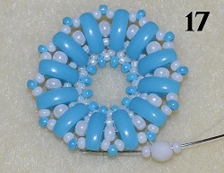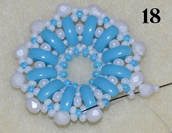 Navlečte 1x PB 10/0, 1x O, 1x PB 10/0 a prošijte 1x PM 10/0 (obr. 17). Postup opakujte do konce řady. Na konci prošijte 1x PM 10/0 a 1x PB 10/0 (obr. 18).