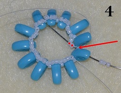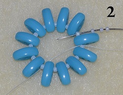 Ustřihněte si nit dlouhou cca 1,5 m. Na jeden konec nitě v délce cca 60 cm navlečte 12x střídavě 1x T 15/0 a 1x C první spodní dírkou (obr. 1). Spojte do kruhu a prošijte ještě jednou dokola. Jehla vychází z T 15/0. Nejprve si ušijete zadní stranu donutu. Navlečte 3x T 15/0 a prošijte 1x T 15/0 (obr. 2). Druhý konec nitě v délce cca 90 cm si ponechejte.