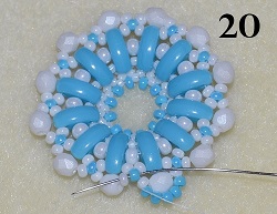 Navlečte 5x PM 10/0 a prošijte 1x PB 10/0 (obr. 19). Prošijte1x PM 10/0 a 1x PB 10/0 (obr. 20). Postup dle obr. 19 a 20 opakujte do konce řady.