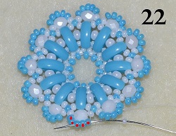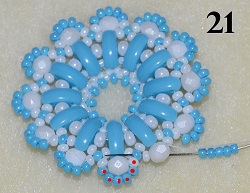 S posledními korálky prošijte 1x PB 10/0, 1x PM 10/0, 1x PB 10/0 a 5x PM 10/0 (obr. 21). Navlečte 1x T 15/0 a prošijte 5x PM 10/0 (obr. 22). Postup dle obr. 22 opakujte do konce řady.