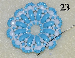 S posledním korálkem T 15/0 prošijte 5x PM 10/0 (obr. 23). Nit postupně zapošijte a ukončete. Na obr. 24 je označeno volné místo mezi korálky, kde vložíte šlupnu.