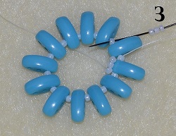 3x T 15/0 z předchozího kroku umístěte před C (obr. 3). Postup opakujte do konce řady. Na konci prošijte korálek T 15/0 mezi korálky C a 2x T 15/0. Jehla vychází ze středového korálku z tří T 15/0 (obr. 4).