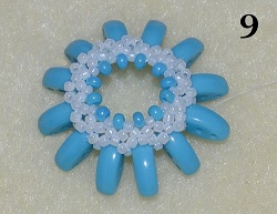 Nit zapošijte a ustřihněte. Zadní stranu donutu máte hotovu (obr. 9). Nyní budete došívat přední stranu. Druhý konec nitě vychází z T 15/0. Prošijte spodní dírkou C (obr. 10).