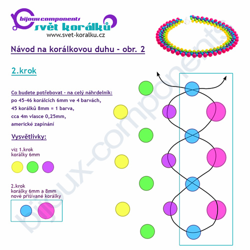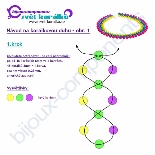 Návod je skutečně velmi snadný a není nutné ani použití jehly. Na krok 1 budete potřebovat cca 2m vlasce, do jeho středu si navlékněte jednu část amerického zapínání a zajistěte uzlíkem. Zapínání umístěte co nejvíce k hornímu okraji náhrdelníku, v našem případě je tedy mezi žlutým a zeleným korálkem. Na jeden konec vlasce poté navlékněte žlutý korálek, na druhý zelený a fialový a oba konce poté provlečte dalším zeleným korálkem. Dále postupujte podle návodu do požadované délky. Na konci opět připevněte druhou část zapínání a to zase mezi zelený a žlutý korálek, aby bylo zapínání na horním okraji náhrdelníku. Než konce vlasce odstřihnete, ještě je provlékněte několika korálky zpět do náhrdelníku. Pokud byste chtěli uzlík ještě zajistit, můžete ho zakápnout průhledným lakem na nehty.