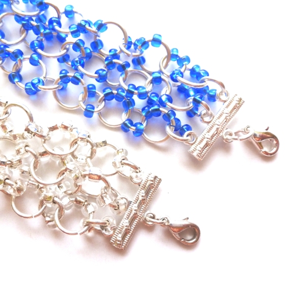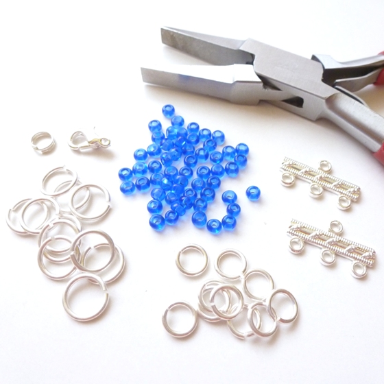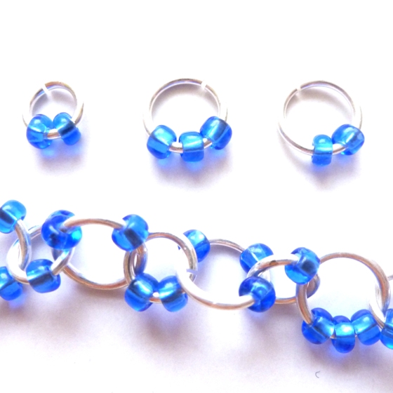 Na 6mm kroužky navlékněte vždy 2 rocaily. Na 8mm kroužky 2 nebo 3 rocaily. Asi nejpraktičtější je nejprve si připravit menší kroužky s rocaily a ty pak navlékat na větší ve chvíli kdy na ně navlékáte rocaily. Takto tedy kroužky spojíme do tří řetízků. Každý z nich se skládá ze 14ks 8mm a 15ks 6mm kroužků.