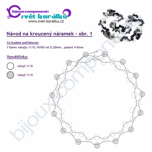 Čtvrtou řadu budeme šít stejným způsobem, pouze budeme přidávat vždy 2 rokajly mezi rokajly přidané v řadě 3. Tím docílíme zvlnění kroužku. Pátou a šestou řadu pak tvoříme také přidáním vždy 2 rokajlů mezi 2 rokajly předchozí řady. Na konci opět znovu prošijte první dva přidané rokajly řady, zajistěte uzlíkem, nit prošijte několika korálky do hotové kroužku a odstřihněte. Stejně prošijte i druhý volný konec Nyma a odstřihněte. A první kroužek nebo spíše taková kudrlinka je hotová.