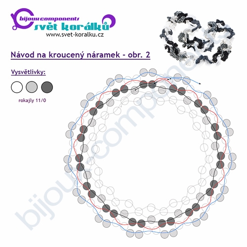 Začněte navlečením 30ks rokajlu jedné barvy na nit a cca 10cm od konce niti zajistěte dvojitým uzlíkem. Jehlu provlékněte vedlejším rokajlem a začněte kruhovým peyote stehem šít třetí řadu všitím vždy jednoho rokajlu tak, jak vidíte na obrázku. Pro přehlednost jsou jednotlivé řady odlišeny barevně. Na konci řady nezapomeňte prošít znovu první přidaný rokajl této řady.
