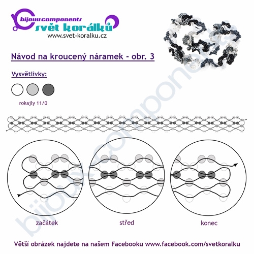 Pokud jste již docílili požadované délky, zbývá pouze ušít poslední kroužek, kterým budete náhrdelník zapínat. Nebudeme tedy šít do kruhu, ale pouze proužek viz obrázek. Větší obrázek naleznete na našem Facebooku. Protože se nám budou konce překrývat (bude na nich přišitý patent) budeme v základní řadě pracovat s 38 rokajly. Výsledný kroužek tak bude stejně velký jako ostatní již ušité.