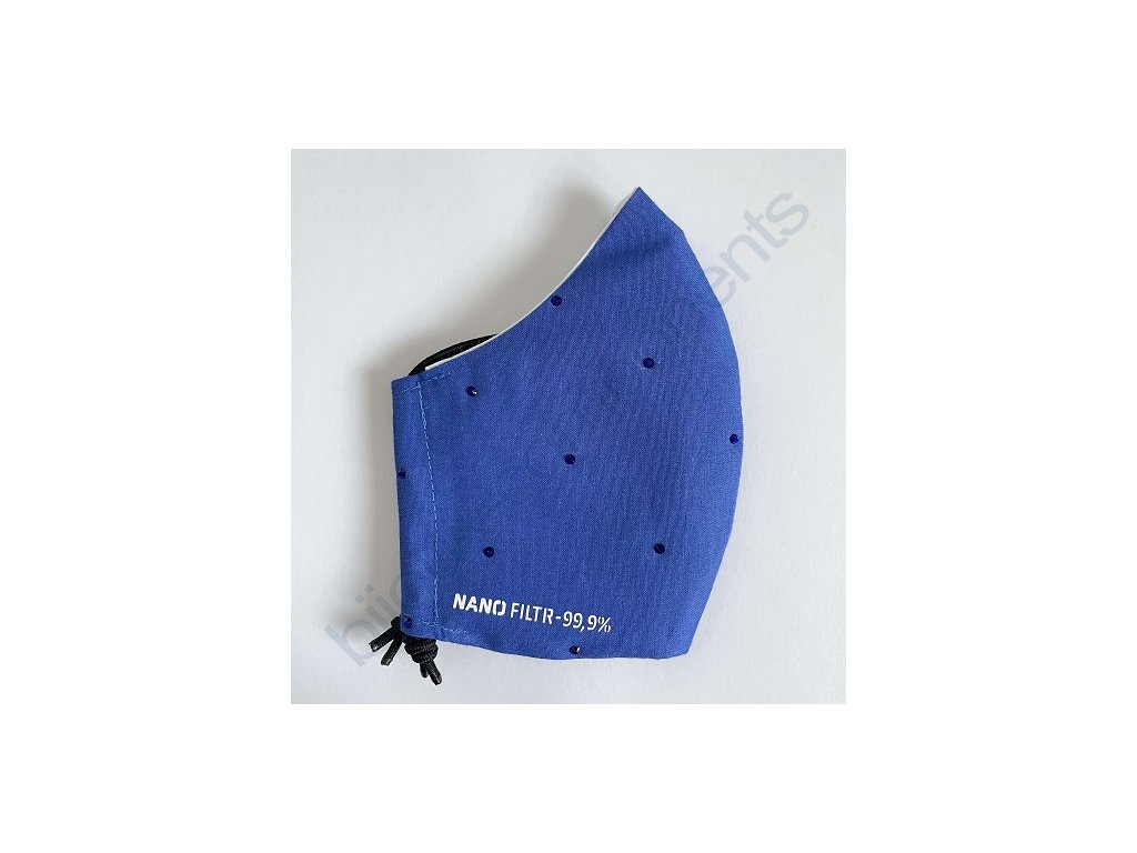Dámská bavlněná nanorouška modrá s modrými kamínky Swarovski Crystals a vyměnitelným nanofiltrem. V případě zájmu lze objednat nanoroušku i v jiné barvě a s jiným dekorem (viz standardní roušky)