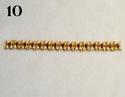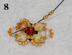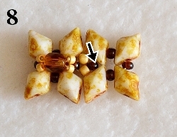 Jehla vychází z prostředního RH 10/0. Navlečte 1x DD, 1x RH 10/0, 1x DD, 1x RH 10/0, 1x DD, 1x RH 10/0, 1x DD a prošijte v protisměru 1x RH 10/0 (obr. 7). Právě přidané korálky prošijte ještě jednou pro větší zpevnění. Jehla vychází z RH 10/0 ve směru znázorněném šipkou (obr. 8).