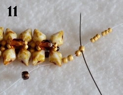 Nyní budete šít očko, do kterého pak dáte kroužky a zapínání. Na novou nit navlečte jeden stop korálek (cca 10cm od konce) nebo použijte stopper, který zabrání posouvání nitě. Prošijte horní dírkou DD, navlečte 4x RZ 11/0, 6x RZ 15/0 a prošijte v protisměru čtvrtým navlečeným RZ 11/0 (obr. 11). Nyní prošijte 2x RZ 15/0, všijte 1x RZ 15/0, prošijte 2xRZ 15/0, všijte 1x RZ 15/0 a prošijte 2x RZ 15/0 a 1x RZ 11/0. Prošijte znovu alespoň jednou pro větší zpevnění 8x RZ 15/0, 1x RZ 11/0. Navlečte 3x RZ 11/0 a prošijte horní dírkou DD (obr. 12).