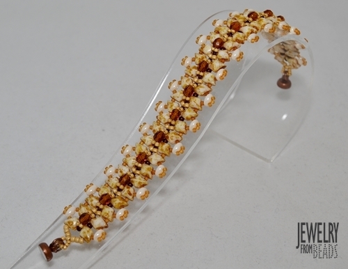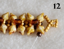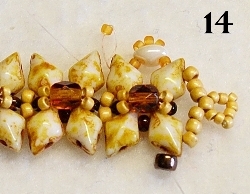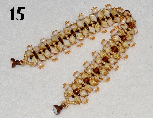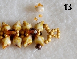 Nyní budete šít okraj náramku. Navlečte 1x RT 15/0, 1x TW, 3x RT 15/0, prošijte právě přidaný TW druhou dírkou, navlečte 1x RT 15/0 a prošijte DD vrchní dírkou (obr. 13). Navlečte 1x RT 15/0 a prošijte následující horní dírku DD (obr. 14). Další kroky se již opakují. Od obr. 13 -14 ušijte okraj jedné strany do konce. Jehla vychází z horní dírky posledního DD v řadě. Nyní ušijte druhé očko dle obr. 11 - 12 a okraj druhé strany dle obr. 13 - 14. Okraje obšijte pro zpevnění ještě jednou (očko již nemusíte) a oba konce nitě zapošijte.