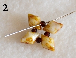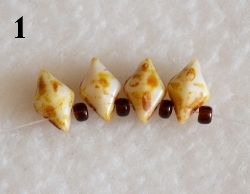 Na jehlu navlečte 1x DD, 1x RH 10/0, 1x DD, 1x RH 10/0, 1x DD, 1x RH 10/0, 1x DD, 1x RH 10/0 (obr.1). Prošijte ještě jednou dokola a zapošijte jeden konec nitě. Jehla musí vycházet z RH 10/0 (obr. 2).