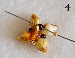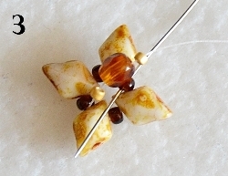 Na jehlu navlečte 1x RZ 15/0, 1x O, 1x RZ 15/0 a prošijte v protisměru RH 10/0 ( obr. 3). Navlečte 1x RZ 15/0, prošijte O, navlečte 1x RZ 15/0 a prošijte RH 10/0 (obr. 4).