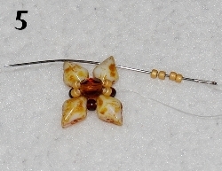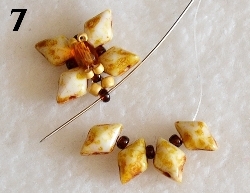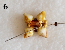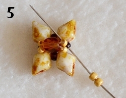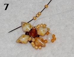 Navlečte 2x RZ 11/0 a prošijte v protisměru 1x RH 10/0 (obr. 5). Prošijte 1x RZ 11/0, navlečte 1x RH 10/0, prošijte 1x RZ 11/0 (obr. 6). Dále prošijte 1x RH 10/0, 1x RZ 11/0 a 1x RH 10/0 viz obr. 7.