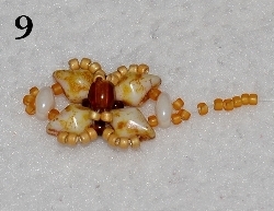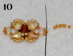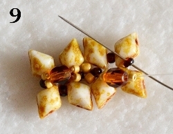 Nyní prošijte následující korálky - 4x RZ 15/0, 1x DD vrchní dírkou, 1x RT 15/0, jednu dírku TW a 2x RT 15/0. Jehla vychází z prostředního RT 15/0. Nyní budete šít očko, do kterého přidáte kroužky a zavěšení. Navlečte 6x RT 15/0 (obr. 9). V protisměru prošijte prostřední RT 15/0 (obr.10). Nyní prošijte postupně právě přidané korálky - 2x RT 15/0, všijte 1x RT 15/0, prošijte 2xRT 15/0, všijte 1x RT 15/0 a prošijte 2x RT 15/0 a prostřední RT 15/0, z kterého jste vycházeli. Celé očko prošijte znovu pro zpevnění a nit zapošijte.