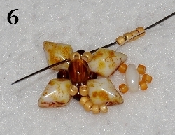 Začněte šít podle postupu u náramku podle obr. 1-4. Jehla vychází z RH 10/0. Navlečte 4x RZ 15/0 a prošijte horní dírku DD (obr. 5). Navlečte 1x RT 15/0, 1x TW, 3x RT 15/0, prošijte druhou dírku právě přidaného TW, navlečte 1x RT 15/0 a prošijte horní dírkou následující DD. Navlečte 4x RZ 15/0, prošijte RH 10/0, navlečte 4x RZ 15/0 a prošijte horní dírku následujícího DD (obr. 6).