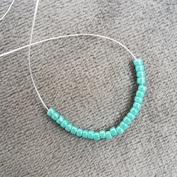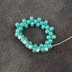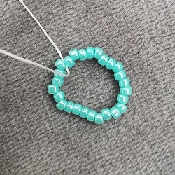 Na jehlu navlékněte 26ks TOHO Round 11/0 a návlek zauzlujte do kroužku. Poté jehlou projeďte několik perliček vedle uzlíku tak, aby se do nich uzlík schoval.