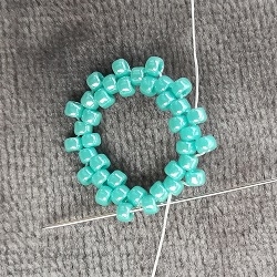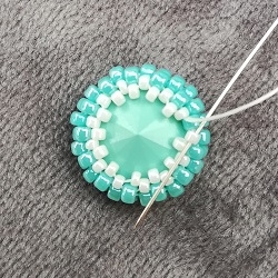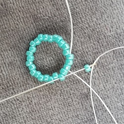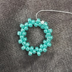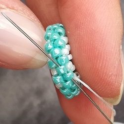 Nyní nám nit vychází z dírky korálku a můžeme začít přidávat druhou řadu perliček. Postupujeme tak, že jednu perličku na nit navlékneme a jehlu protáhneme „ob jednu“ perličku v kruhovém návleku. Takto přidáváme perličky po celém obvodu kruhu, po poslední přidané projedeme jehlou ven z první, kterou jsme do druhé řady přidávali. Dobře utahujeme.