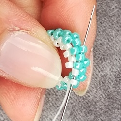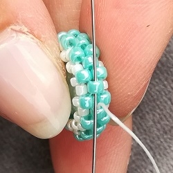 Po dovlečení všech perliček převlékneme nit opět provlečením první přidávané perličky o řadu výš. Opět přidáváme TOHO 15/0 mezi perličky předchozí řady. Po dokončení druhé řady z TOHO 15/0 (celkově čtvrté) se tentokrát vrátíme následujícími perličkami na druhou stranu „mističky“.