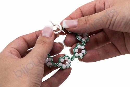 Poté každým z konců obšijete již ušitou kytičku po obvodu a křížem prošijete opět protilehlý středový rokajl korálkové obruby kytičky. Stejně jako jste utvořili očko na začátku budete kytičky i spojovat. Na každý konec přidejte 3 rokajly 10/0 a přišijte další kytičku. A právě nyní si můžete délku nastavit přidáním nebo ubráním rojaklů v tomto spoji.
