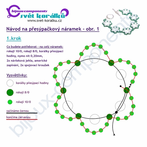 Celý postup je velmi snadný, je tedy vhodný i pro začátečníky. V prvním kroku si vystačíte s jednou jehlou a budete šít jednotlivé kytičky. Nymo si můžete ustřihnout delší a po ukončení každé kytičky odstřihnout a pokračovat dále. Nejprve si navlékněte na střídačku 6x korálek přesýpací hodiny a 6x rokajl velikosti 8/0 a zajistěte uzlíkem cca 10cm od konce Nyma.