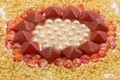 Navlékněte rokajl, ohňovku, rokajl, ohňovku a rokajl a prošijte perličkou z prvního kroku tak, aby vznikla z právě přidaných korálků špička a prošijte i první 3 korálky z této špičky (rokajl, ohňovka a rokajl).
