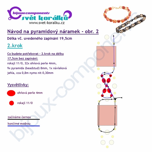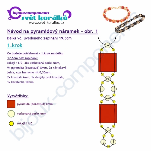 Základní postup je velmi snadný a již v několika předchozích návodech použitý. Na oba konce Nyma si navlékněte jehlu, do středu nitě navlečte rokajl, perličku, rokajl, perličku, rokajl a perličku. Poslední perličkou pak prošijte i opačný konec Nyma, utvoříte tak očko. Dále na oba konce Nyma navlékněte rokajl, pyramidu a rokajl. Pyramida je společná pro obě nitě, protože má 2 dírky. Další očko doděláte provlečením obou konců voskovanou perličkou. Další postup bude totožný, jen místo pyramidy budou 2 voskované perličky, tedy na každou nit zvlášť a spojíte opět provlečením jedné perličky oběma směry.