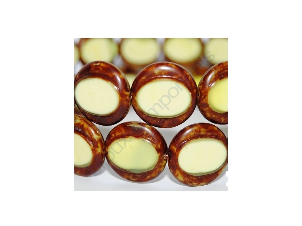 Ručně ploškované korálky - kulaté s vybroušeným oválem, žluté s travertinovým okrajem