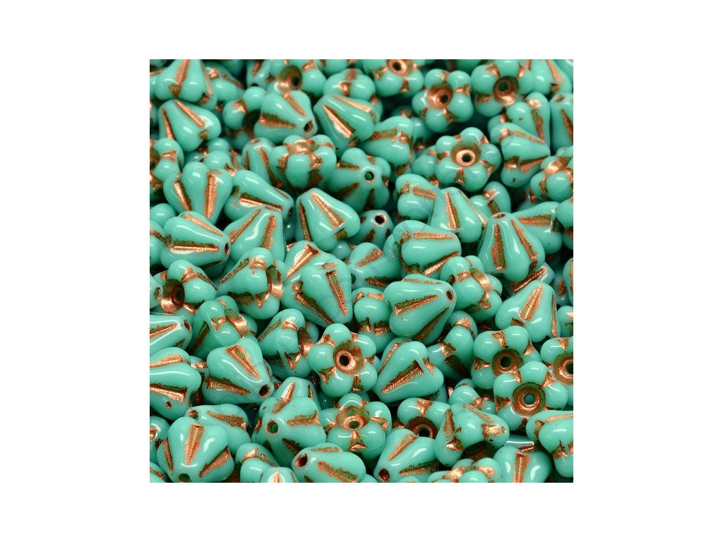 Skleněné korálky mačkané - kytičky / zvonečky, tyrkysové s měděným zatíráním