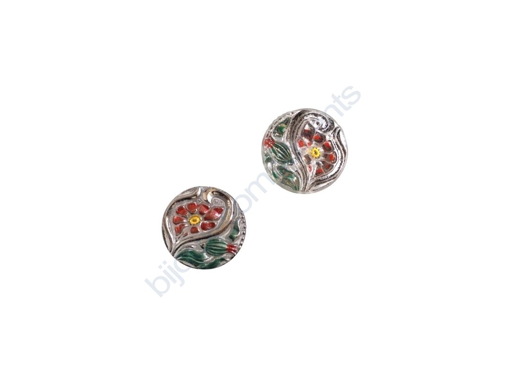 Skleněný kabošon z krystalového skla s barevným květinovým motivem, ústředním prvkem je drobný kvítek s okvětními lístky v červené barvě a výrazným žlutým středem. Květ doplňují zelené listy, které se obtáčejí podél okraje.