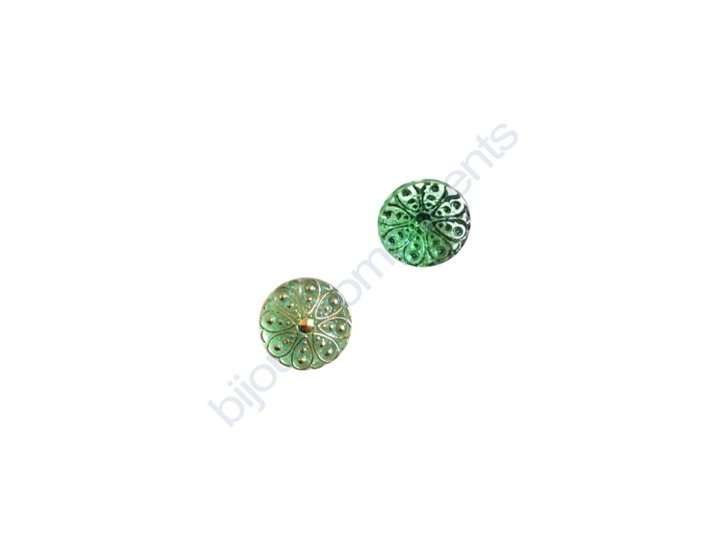 Skleněný kabošon ze zeleného z uranového skla s květinovým motivem, s jemným zlatým zdobením.