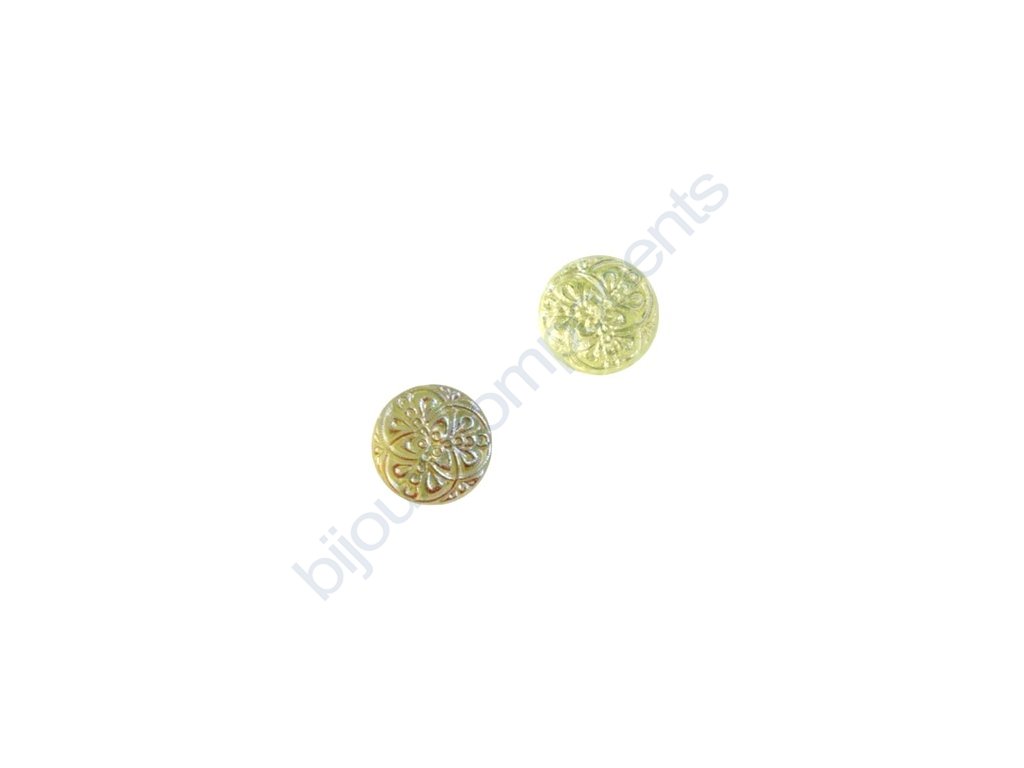 Skleněný kabošon, s květinovým motivem, žluté uranové sklo, s vrchním AB pokovem
