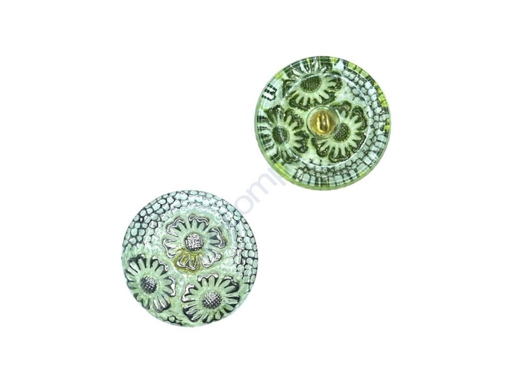 Skleněný knoflík, s květinovým motivem, zelené uranové s platinovým zdobením
