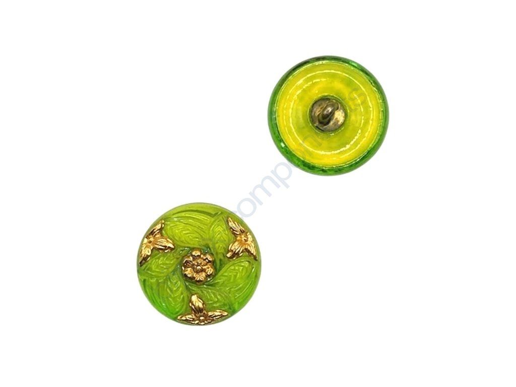 Tento skleněný knoflík z uranového skla je ideální volbou pro ty, kteří hledají výrazný a stylový detail pro své oděvy. Jeho zářivě limetková barva dodá každému kousku moderní a svěží vzhled. Knoflík je decentně dekorován zlatým zdobením.